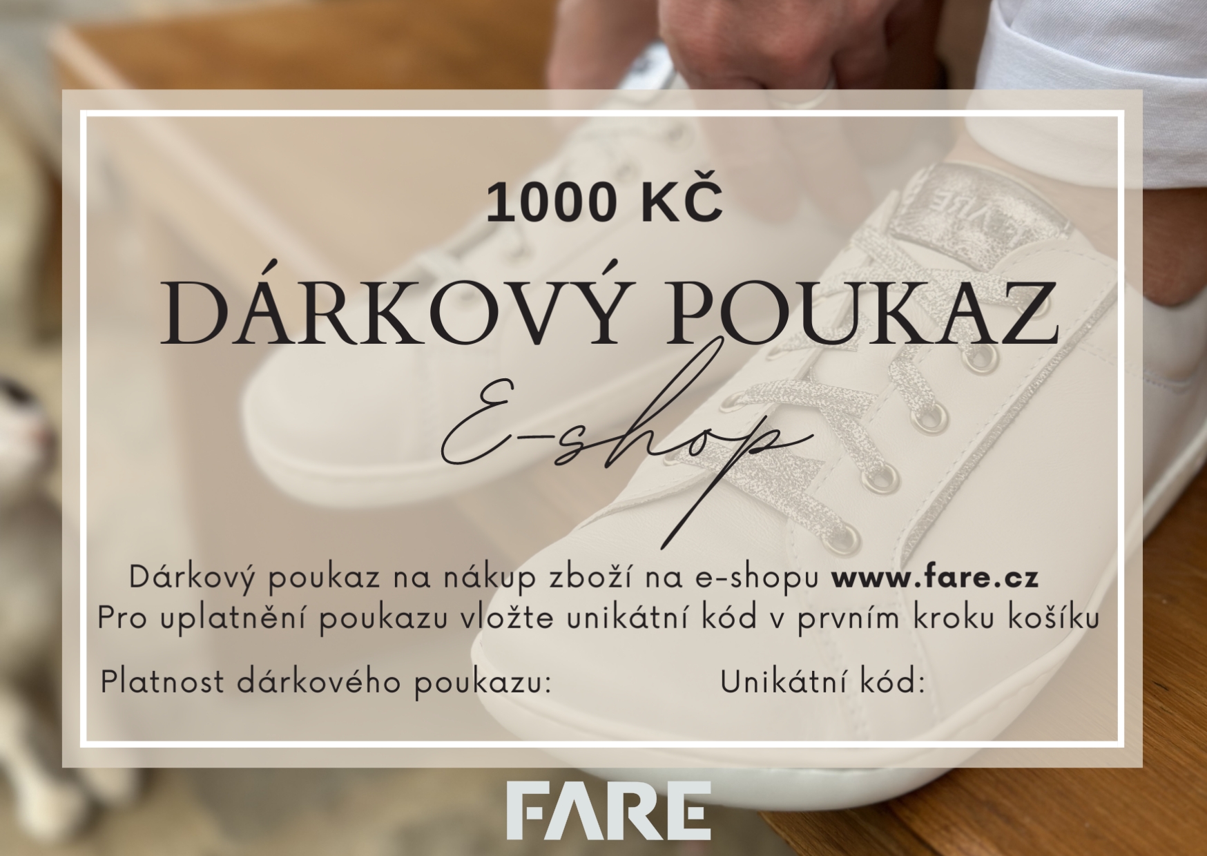 Hledáte vhodný dárek pro své blízké? Nechte je vybrat z naší široké nabídky podle jejich vkusu. Dárkový poukaz je možné uplatnit pouze na e-shopu www.fare.cz, a to vložením unikátního jednorázového kódu do košíku. Platnost dárkového poukazu je 1 rok od data vystavení. Dárkový poukaz odesíláme elektronicky ve formátu PDF po úhradě objednávky.