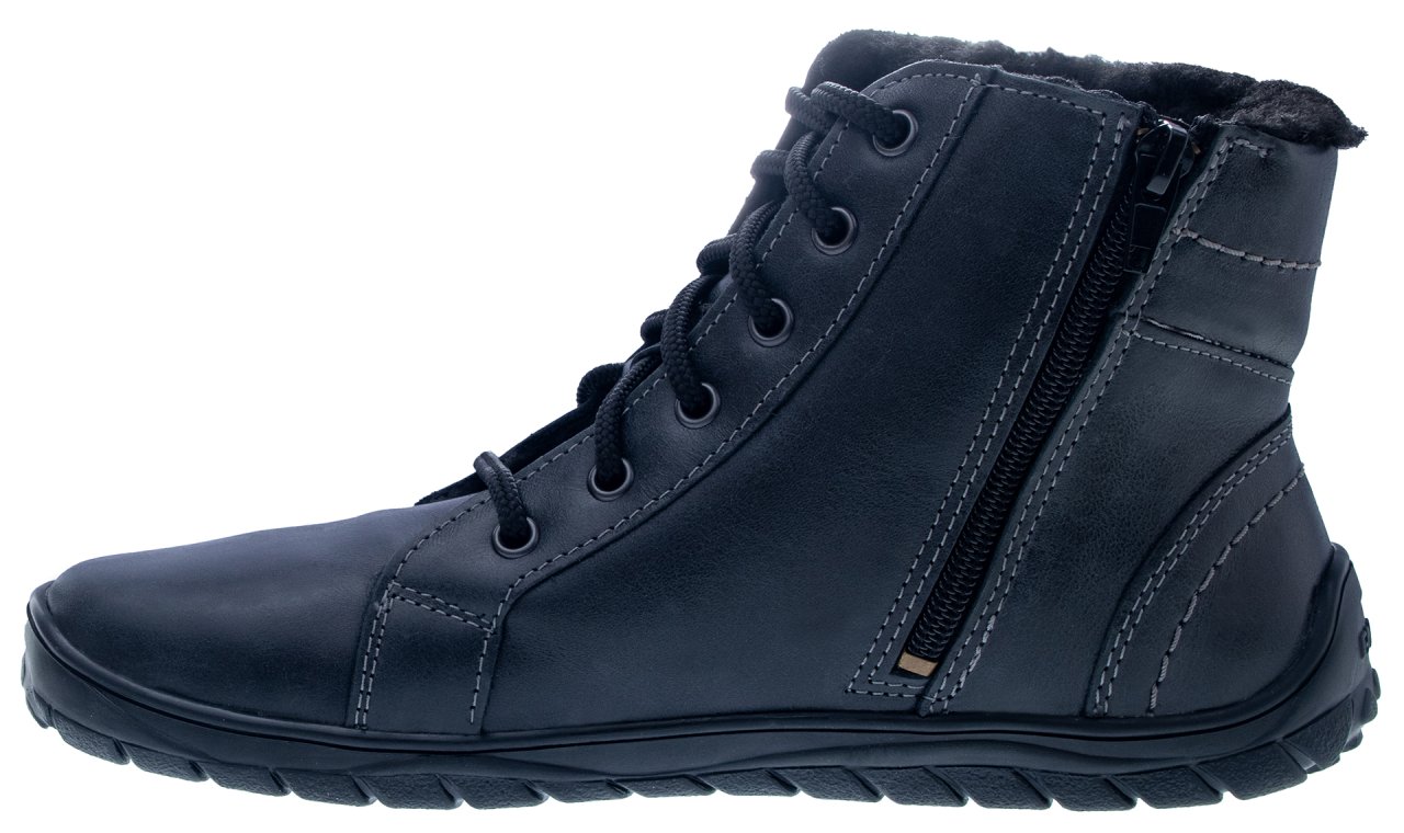 Zimní štróblovaná kotníková obuv, šněrovací, s bočním zipem. Našívací (štróblovaná) stélka umožňuje lepší flexibilitu boty. Vrchový materiál: přírodní hovězinová useň lícová. Podšívka je zimní s hřejivým, středně dlouhým vlasem, stélka je vyrobena z vlny MERINO. Podešev je vyrobena z termokaučuku, jehož složení splňuje parametry pro používání v zimním období.