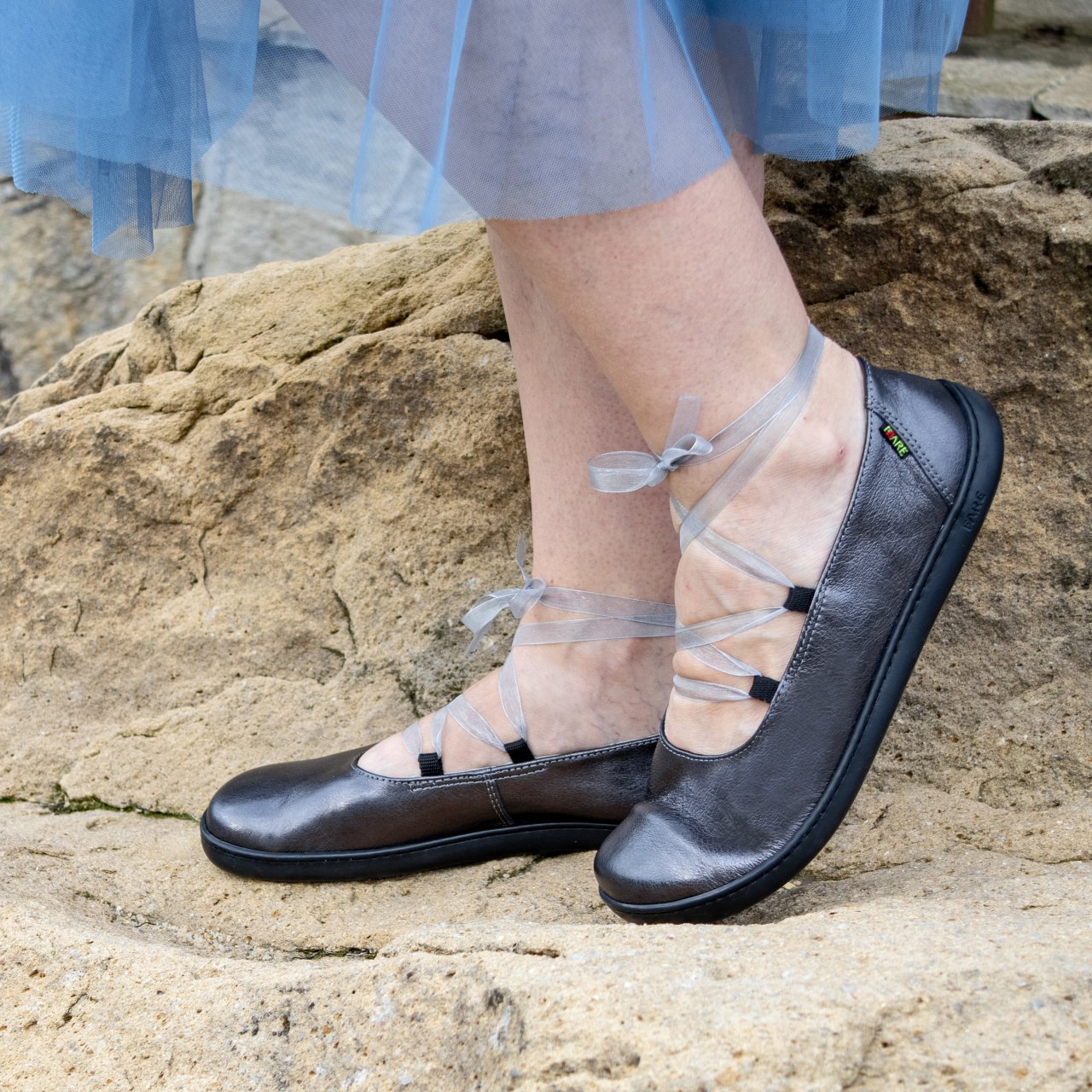 Dámské barefoot baleríny řady A vynikají elegantním designem doplněným o jemný metalický efekt, který dodává obuvi výraznější, ale stále vkusný vzhled. Obšívaná podešev a čisté linie podtrhují nadčasový charakter modelu vhodného pro každodenní nošení i formálnější příležitosti.
