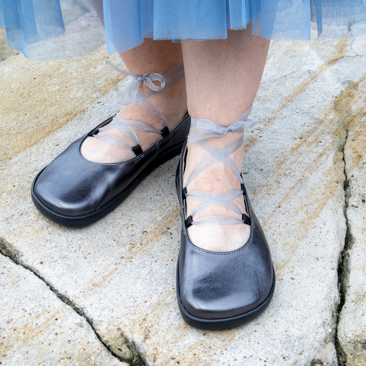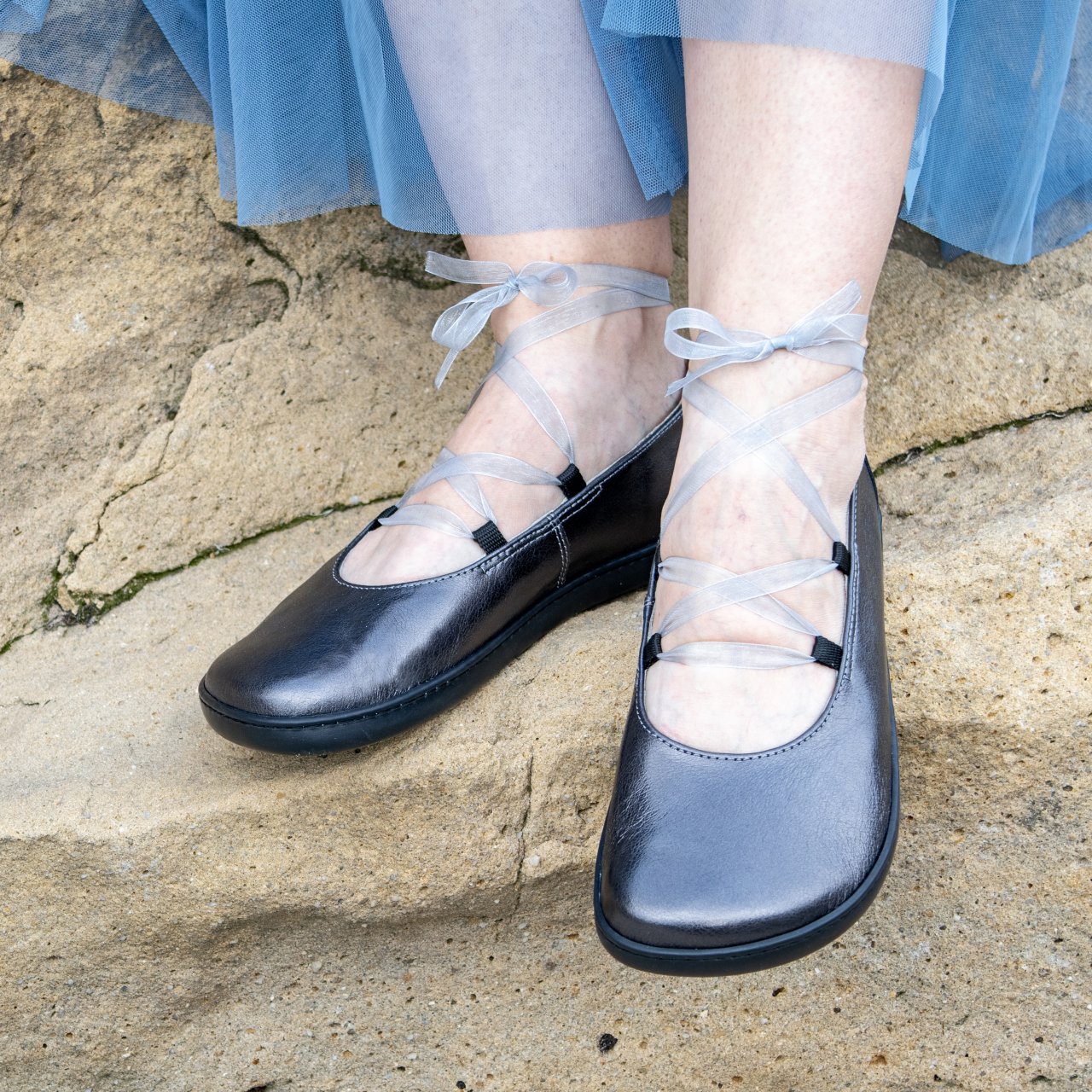Dámské barefoot baleríny řady A vynikají elegantním designem doplněným o jemný metalický efekt, který dodává obuvi výraznější, ale stále vkusný vzhled. Obšívaná podešev a čisté linie podtrhují nadčasový charakter modelu vhodného pro každodenní nošení i formálnější příležitosti.