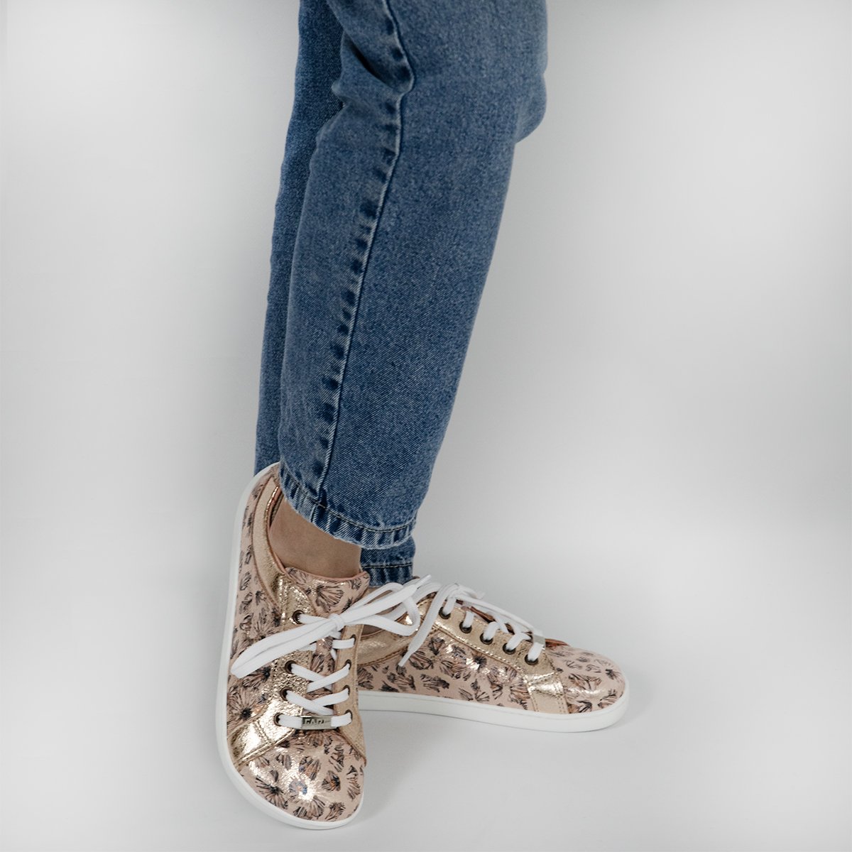 Svršek z pravé hladké hovězinové kůže s květinovým vzorem zajišťuje dostatečnou odolnost a zároveň jemně výrazný vzhled. Anatomický barefoot tvar poskytuje dostatek prostoru pro prsty a podporuje jejich přirozenou práci při chůzi. Střih je vhodný pro středně vysoký a vyšší nárt, což napomáhá správnému usazení nohy v botě.