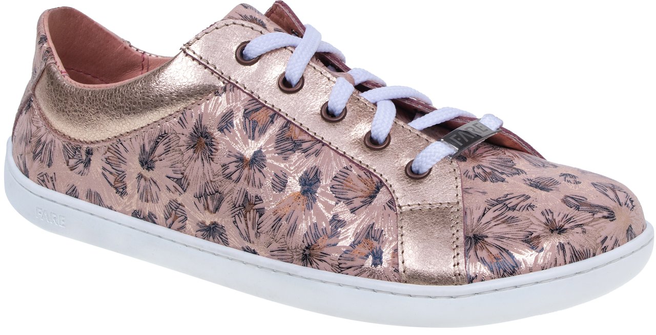 Svršek z pravé hladké hovězinové kůže s květinovým vzorem zajišťuje dostatečnou odolnost a zároveň jemně výrazný vzhled. Anatomický barefoot tvar poskytuje dostatek prostoru pro prsty a podporuje jejich přirozenou práci při chůzi. Střih je vhodný pro středně vysoký a vyšší nárt, což napomáhá správnému usazení nohy v botě.