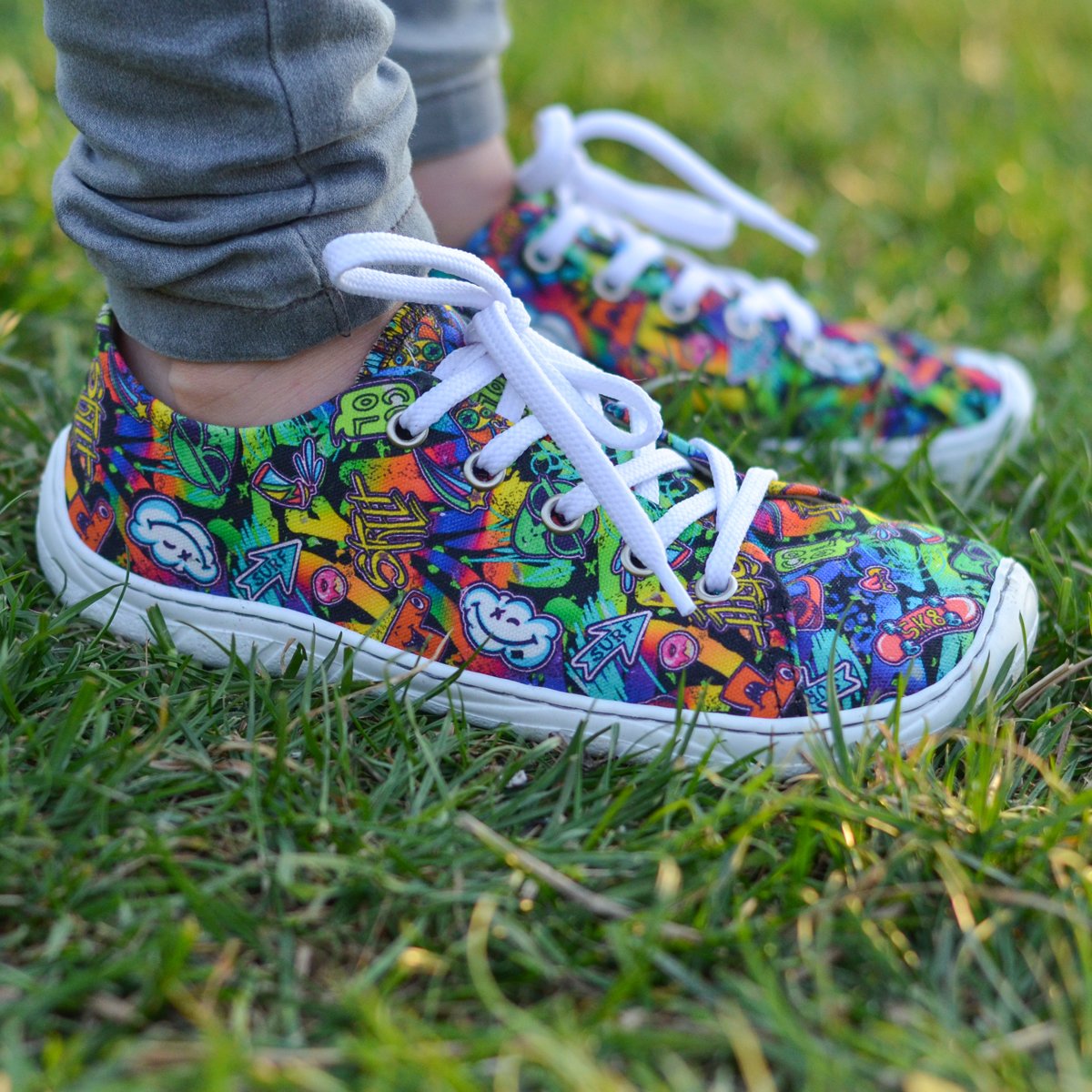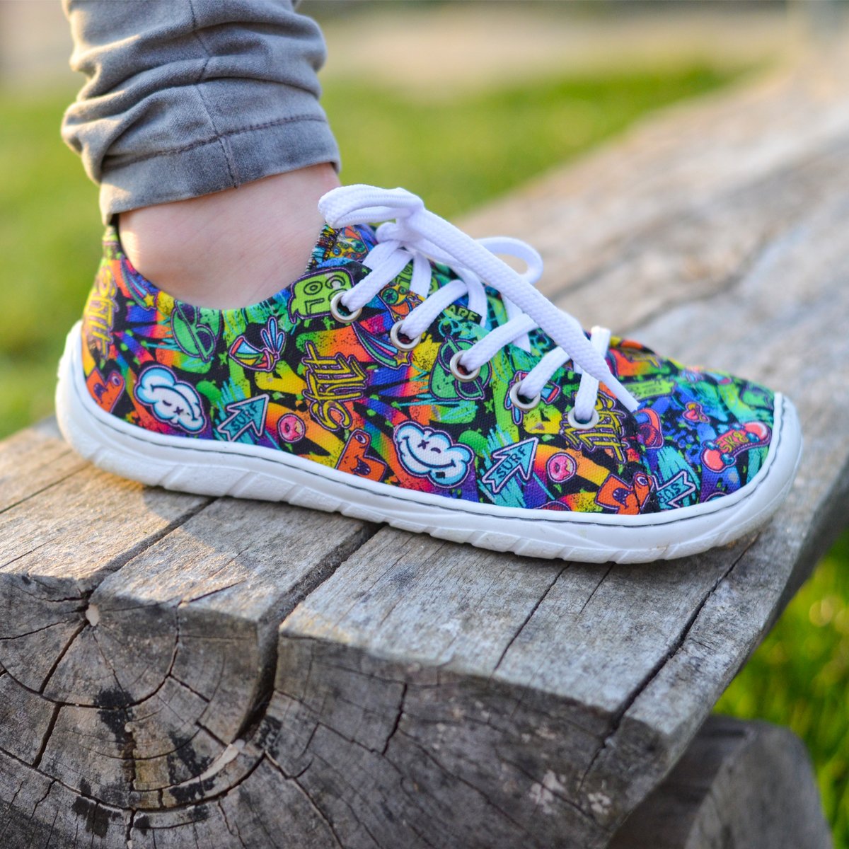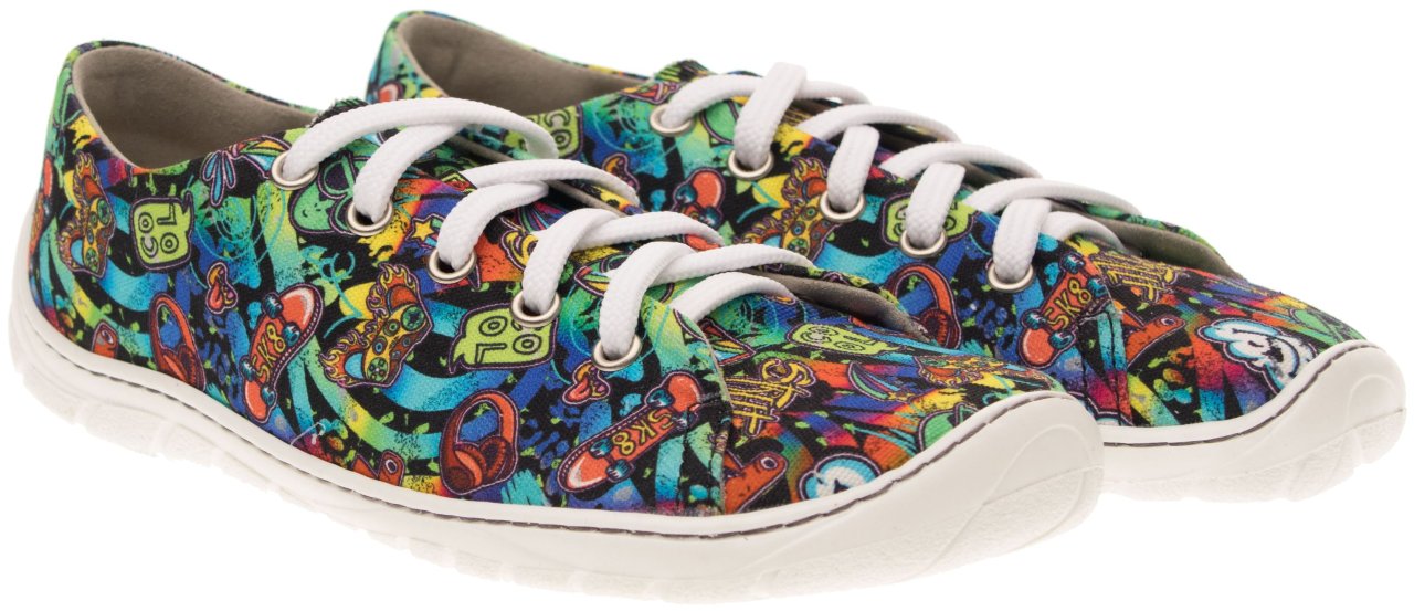 Textilní svršek s barevným potiskem dodává obuvi hravý vzhled a zároveň zajišťuje prodyšnost. Střih je vhodný pro chodidla se středně vysokým až vyšším nártem a dobře se přizpůsobí tvaru nohy.
