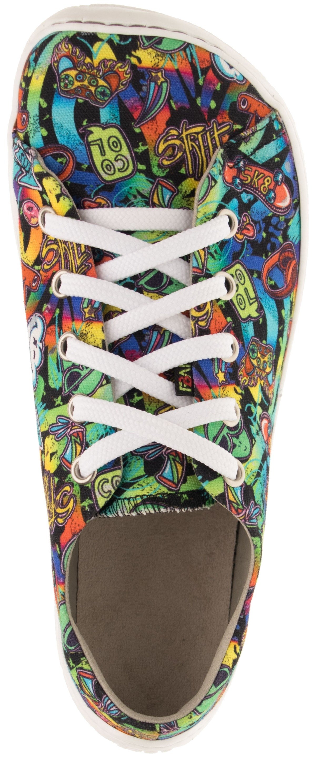 Textilní svršek s barevným potiskem dodává obuvi hravý vzhled a zároveň zajišťuje prodyšnost. Střih je vhodný pro chodidla se středně vysokým až vyšším nártem a dobře se přizpůsobí tvaru nohy.