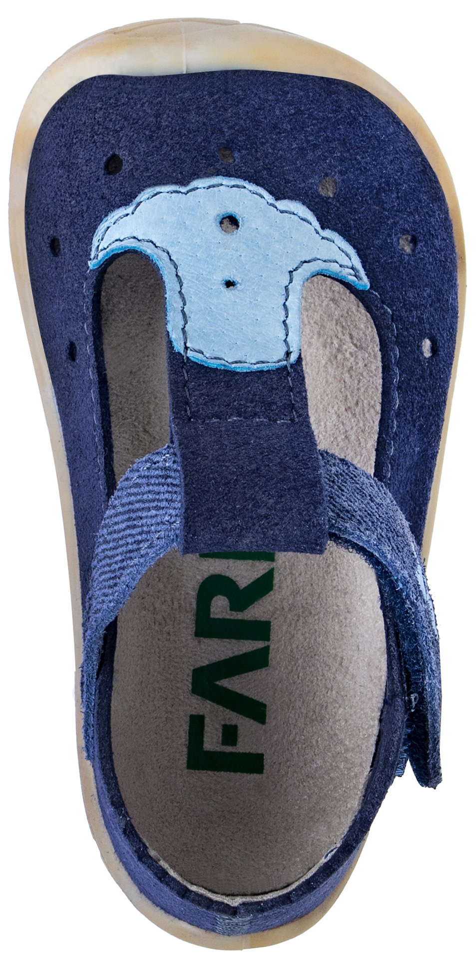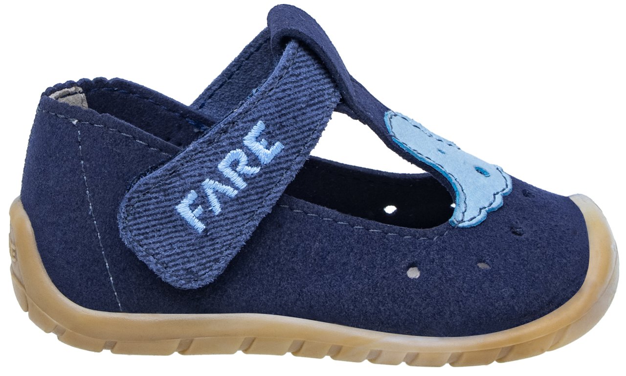 Lehoučké, flexibilní, s anatomickým tvarem a nulovým dropem – ideální pro první krůčky. Stylové sandálky v námořnické modré barvě, ideální pro malé objevitele, které se právě učí chodit. Vyrobené ze speciálního textilního materiálu, který má vzhled semišové/velurové usně. Díky praktickému střihu je snadno nazujete a přizpůsobíte dětské nožce. Pásek z kůže pro kvalitní a odolné používání s výšivkou FARE. Dodáváno v krásné dárkové krabičce.