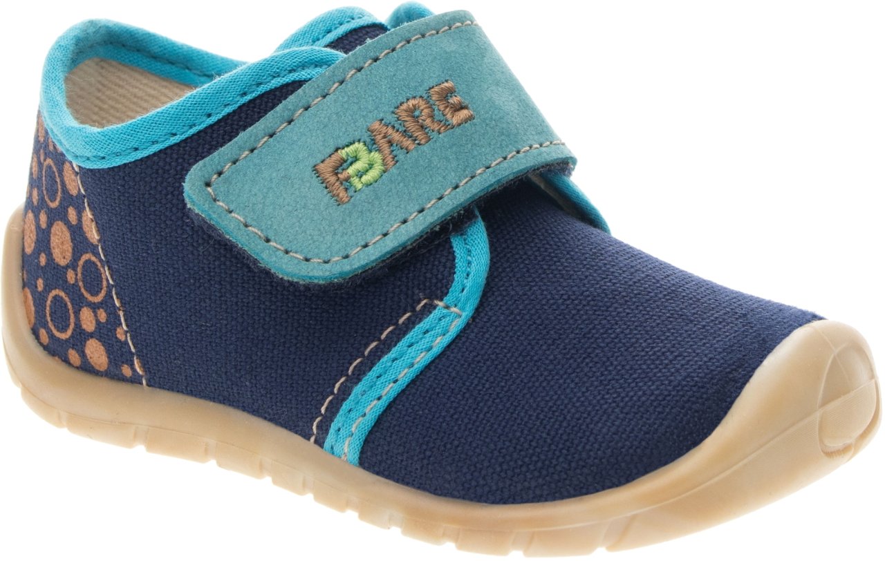 Dětská štróblovaná obuv na suchý zip. Našívací (štróblovaná) stélka umožňuje lepší ohyb boty. Vrchový materiál: textil. Podšívka: bez podšívky. Podešev je vyrobena z termokaučuku, který je velmi flexibilní příčně, ale i podélně.