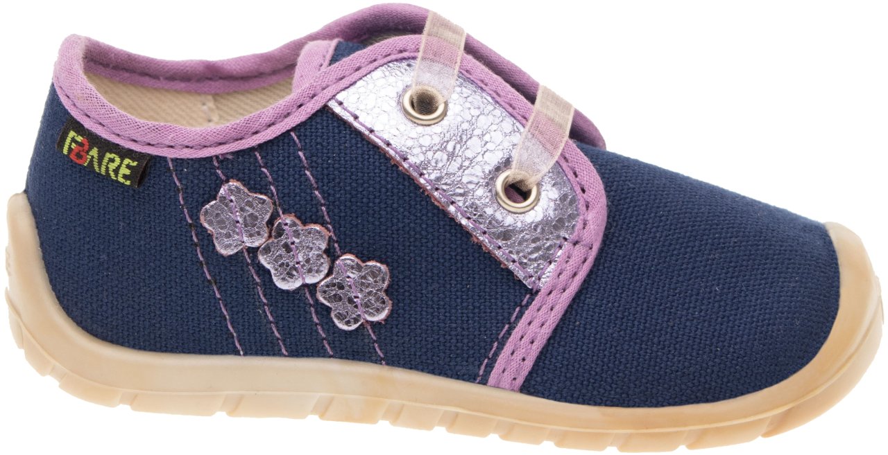 Dětská štróblovaná obuv, šněrovací. Našívací (štróblovaná) stélka umožňuje lepší ohyb boty. Vrchový materiál: textil. Podšívka: bez podšívky. Podešev je vyrobena z termokaučuku, který je velmi flexibilní příčně, ale i podélně.
