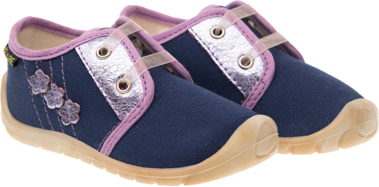 Dětská štróblovaná obuv, šněrovací. Našívací (štróblovaná) stélka umožňuje lepší ohyb boty. Vrchový materiál: textil. Podšívka: bez podšívky. Podešev je vyrobena z termokaučuku, který je velmi flexibilní příčně, ale i podélně.