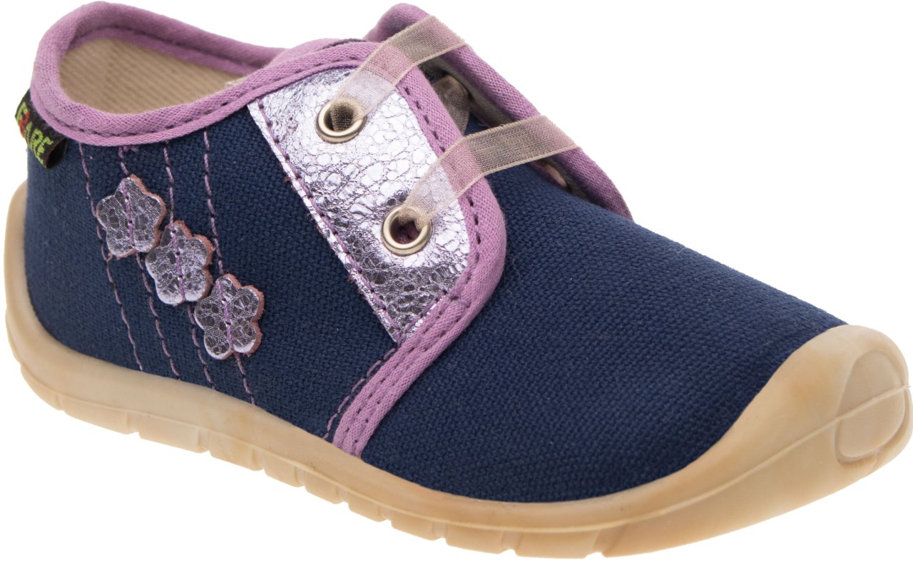 Dětská štróblovaná obuv, šněrovací. Našívací (štróblovaná) stélka umožňuje lepší ohyb boty. Vrchový materiál: textil. Podšívka: bez podšívky. Podešev je vyrobena z termokaučuku, který je velmi flexibilní příčně, ale i podélně.