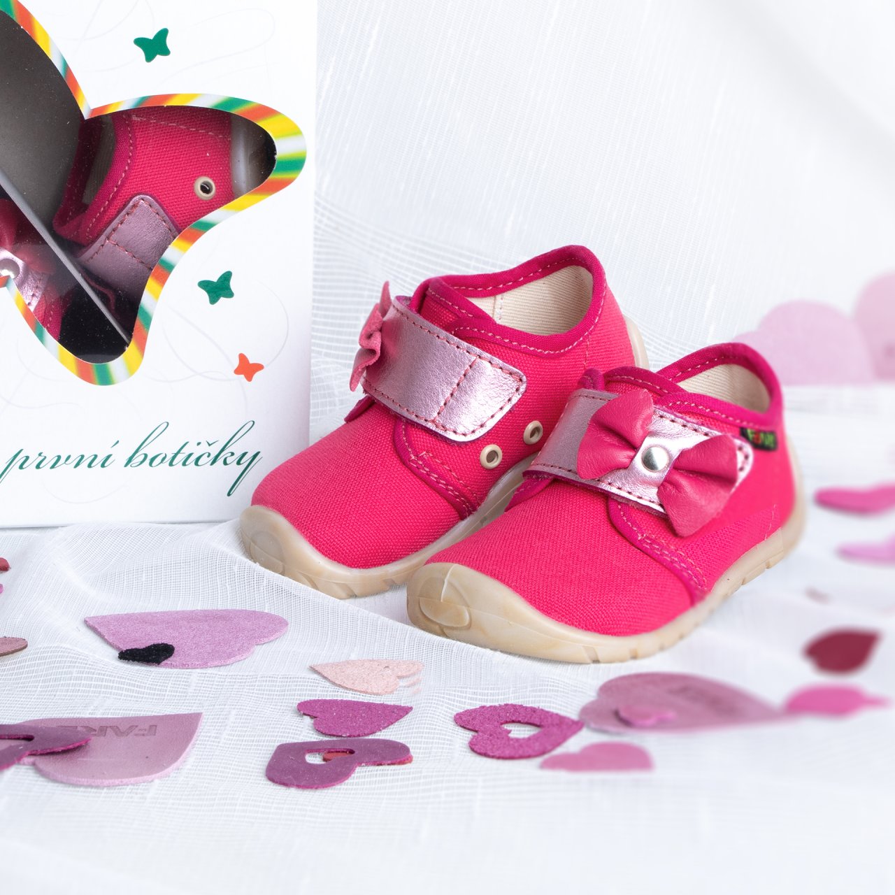 Dětská štróblovaná obuv na suchý zip. Našívací (štróblovaná) stélka umožňuje lepší ohyb boty. Vrchový materiál: textil. Podšívka: bez podšívky. Podešev je vyrobena z termokaučuku, který je velmi flexibilní příčně, ale i podélně.