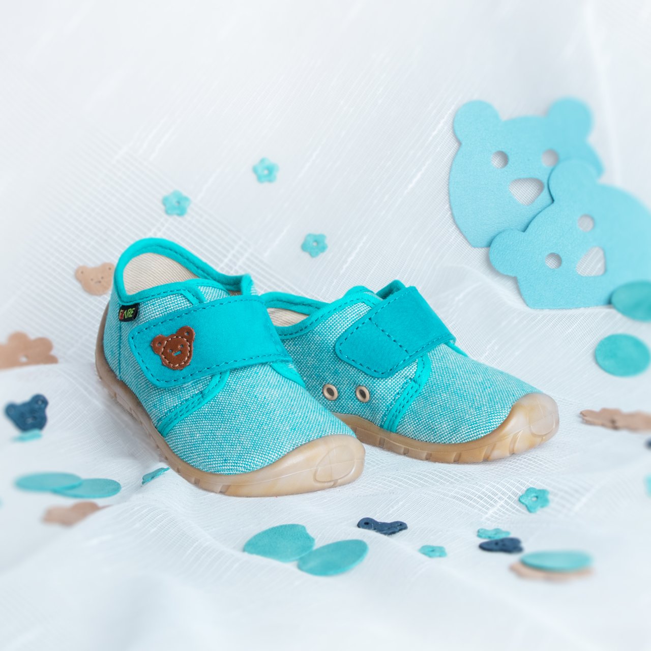 Dětská štróblovaná obuv na suchý zip. Našívací (štróblovaná) stélka umožňuje lepší ohyb boty. Vrchový materiál: textil. Podšívka: bez podšívky. Podešev je vyrobena z termokaučuku, který je velmi flexibilní příčně, ale i podélně.