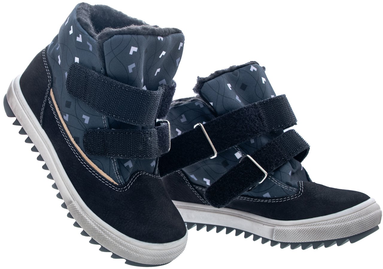 Zimní štróblovaná kotníčková obuv se zapínáním na suchý zip. Našívací (štróblovaná) stélka umožňuje lepší flexibilitu boty. Vrchový materiál: hovězinová useň boušená (nubuk) v kombinaci s textilem. Podšívka je zimní s hřejivým středně dlouhým vlasem.