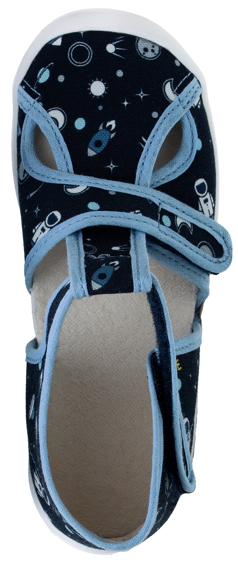 Přezůvková, nízká, textilní, lemovaná obuv na suchý zip. Materiál svršku je z barevného bavlněného materiálu. Vnitřek je taktéž z bavlněného kepru. Podešev je vyvinuta jako odlehčená, materiál podešve je TPE. Podešev je neklouzavá pro všechny běžně používané podlahoviny. Tato domácí a přezůvková obuv odpovídá zásadám zdravého obouvání. Obuv je v prstové části prostorově vytvarována, je vybavena pevným opatkem. Vkládací stélka je vybavena komfortní tlumící vrstvou a klenbovou podporou. Obuv je designována v souladu s módními trendy, včetně podešve, která chrání přední část před rychlým opotřebením.