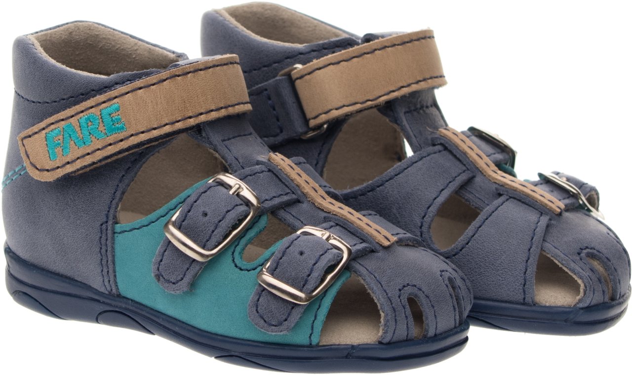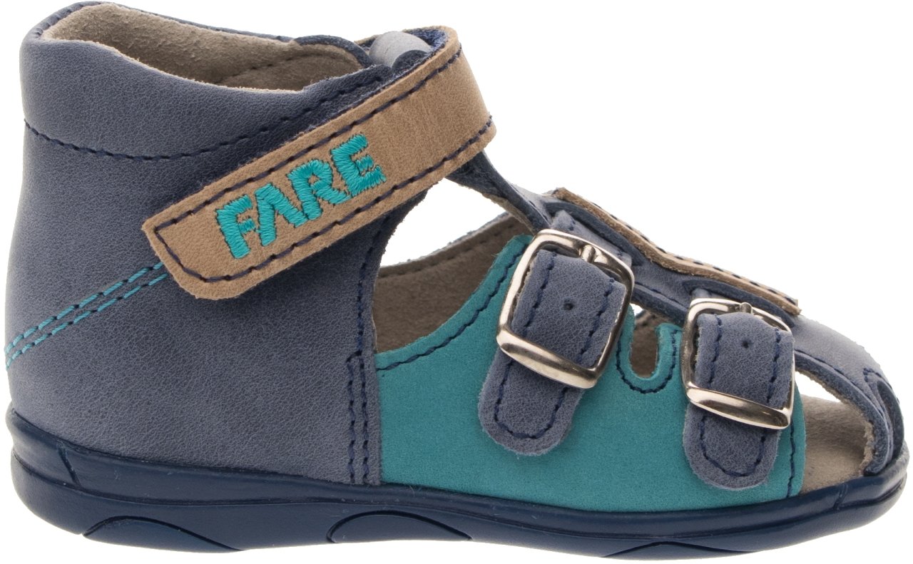 Sandálková obuv, zapínání na suchý zip. Vrchový materiál - pravá kůže hladká. Podšívka - pravá kůže. Podešev je z termoplastického kaučuku. Předností je vypolstrovaná stélka, částečně uzavřená špice, regulovatelnost obuvi přes nárt, pevný opatek a výška paty - v tomto věku dítěte velmi důležitá.