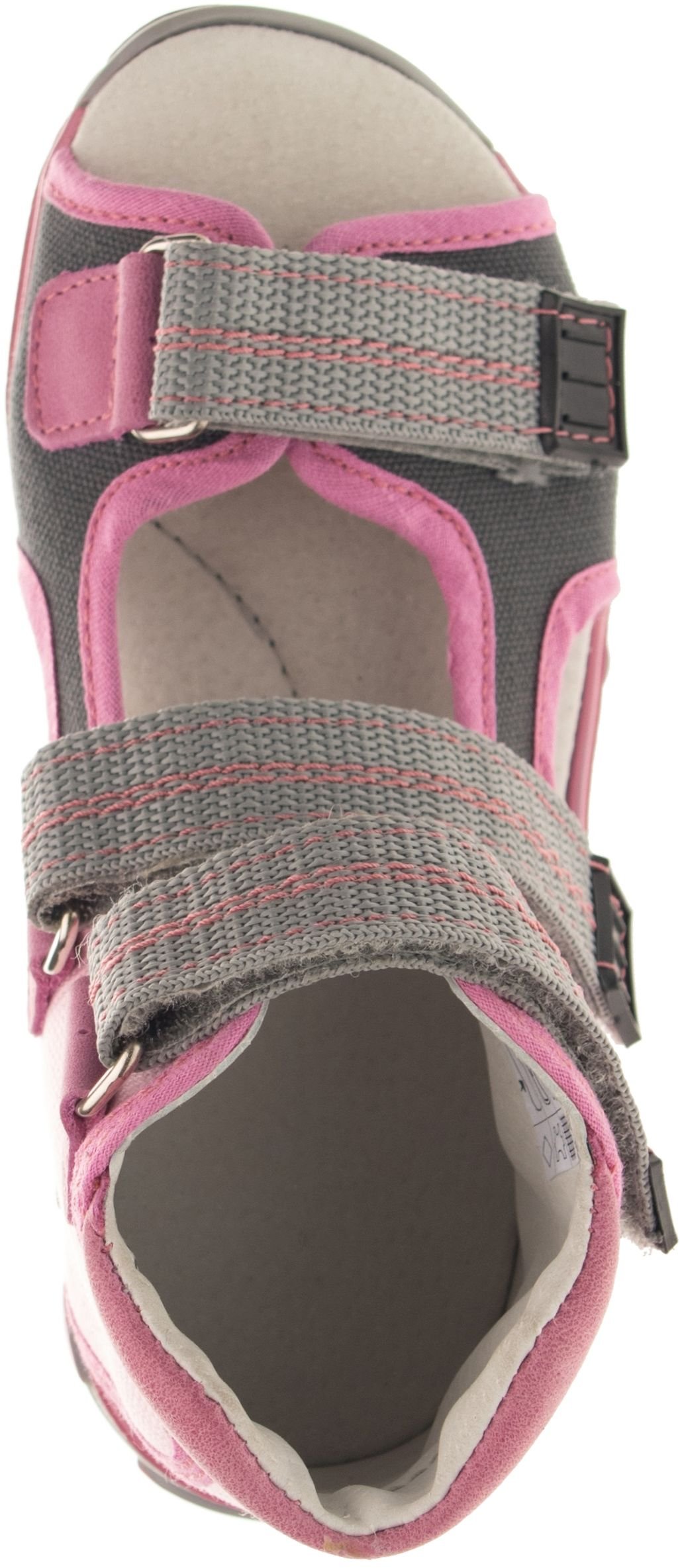 Sandálková obuv bez špice se zapínáním na velkro. Vrchový materiál - textil. Podšívka - pravá kůže. Podešev je z termoplastického kaučuku. Předností je vypolstrovaná stélka, regulovatelnost obuvi přes nárt a pevný opatek.