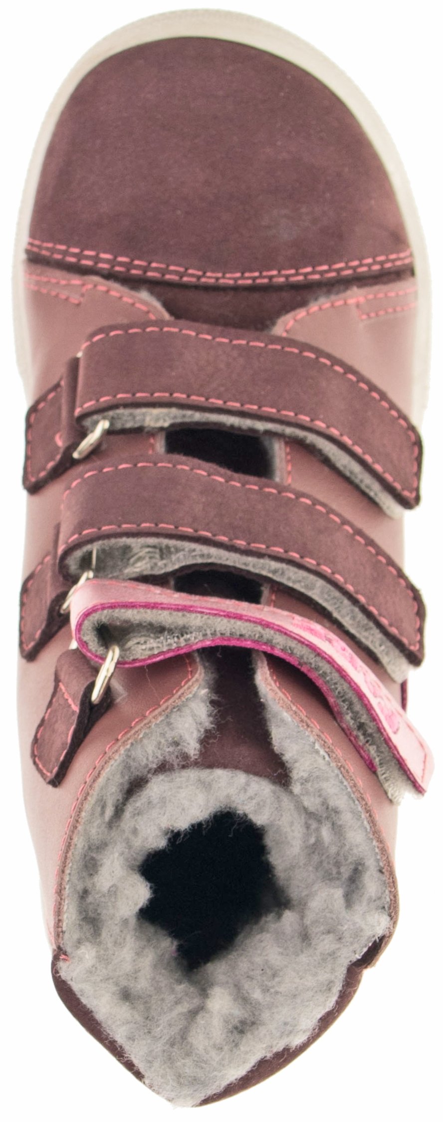 Kvalitní kotníčková kožená obuv v bordó barvě, která okouzlí nejen svým stylovým vzhledem, ale i kvalitním zpracováním a promyšleným střihem. Boty jsou doplněny roztomilou aplikací medvěda v jemně metalízově růžové barvě, což přidává špetku hravosti. Díky snadnému zapínání na suchý zip zvládnou děti boty pohodlně obout samy. Zimní podšívka s hřejivým středně dlouhým vlasem zajistí, že dětská chodidla zůstanou v teple a pohodlí i během chladných dní.